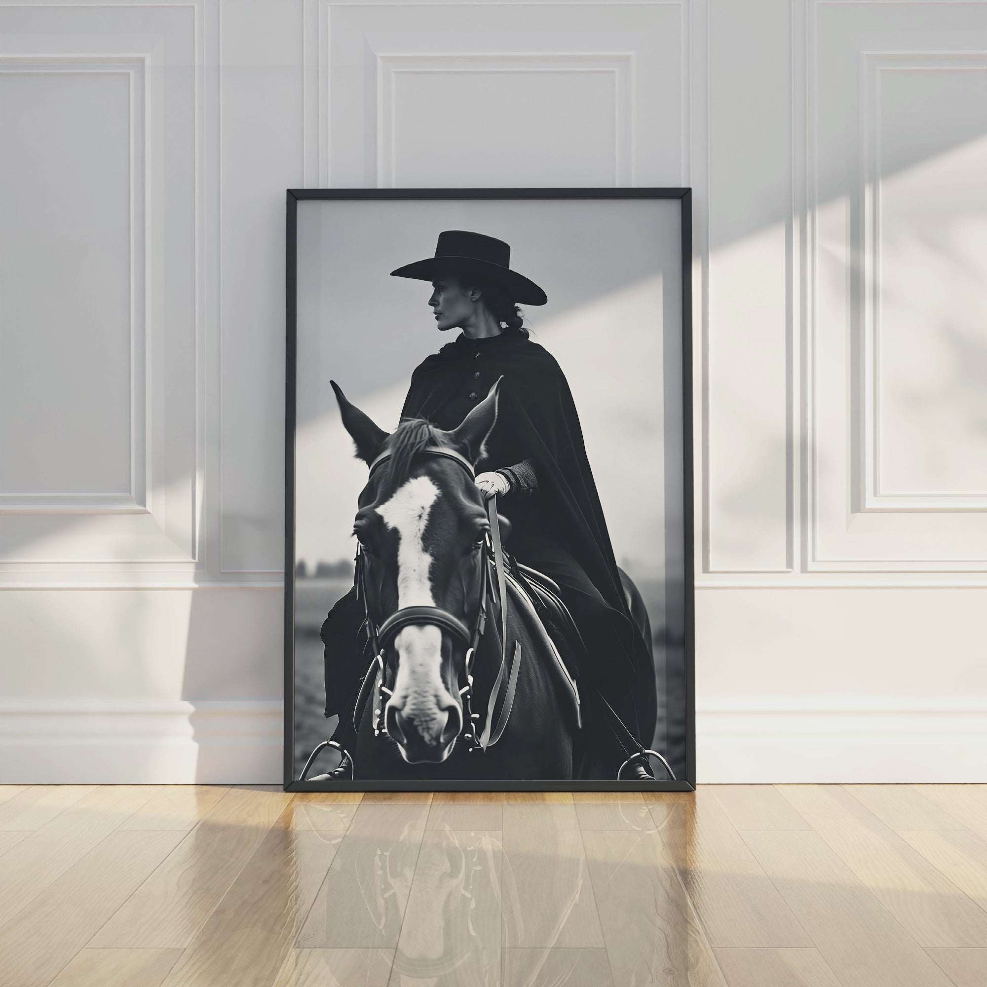 Cowgirl Rider: Western Woman on Horseback - Black & White Photo Style Art Print
