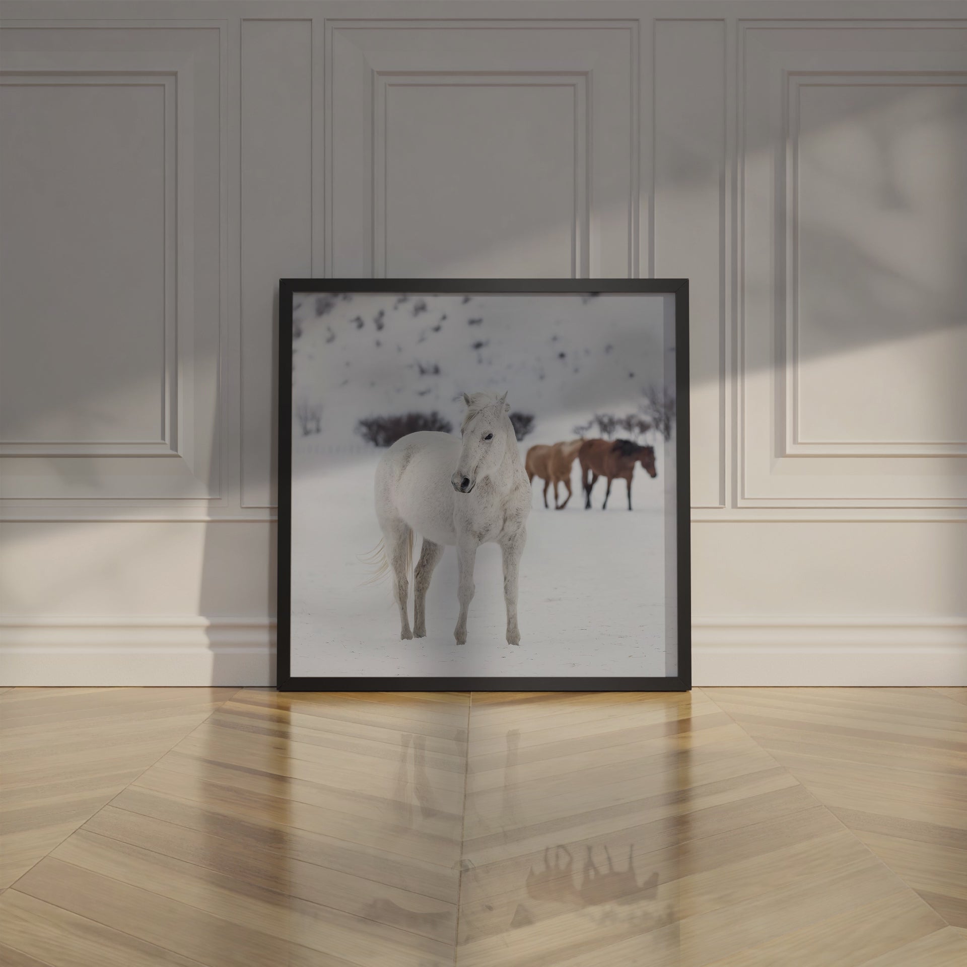 A curious horse poses for the camera in the snow and mingles with a mixed herd of wild and domesticated horses on a ranch, in a photo from Carol Highsmith's "America", which captures the spirit of the West. This western print adds character to any room and makes a great gift.