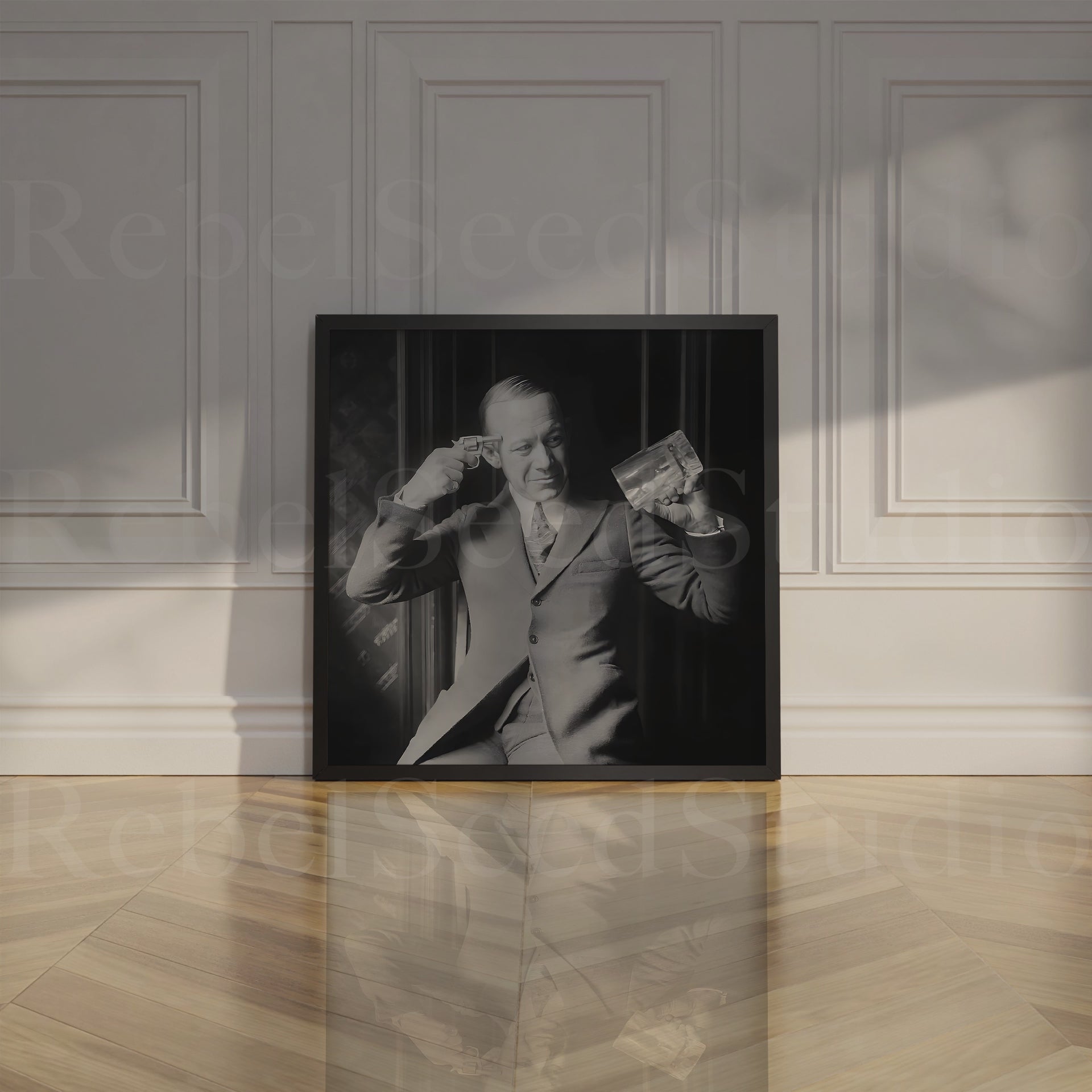 In this restored vintage 1920 black & white photograph, American singer Ernie Hare jokingly pantomimes his displeasure of Prohibition. This whimsical and fun Americana print adds character to any room and makes a great gift.