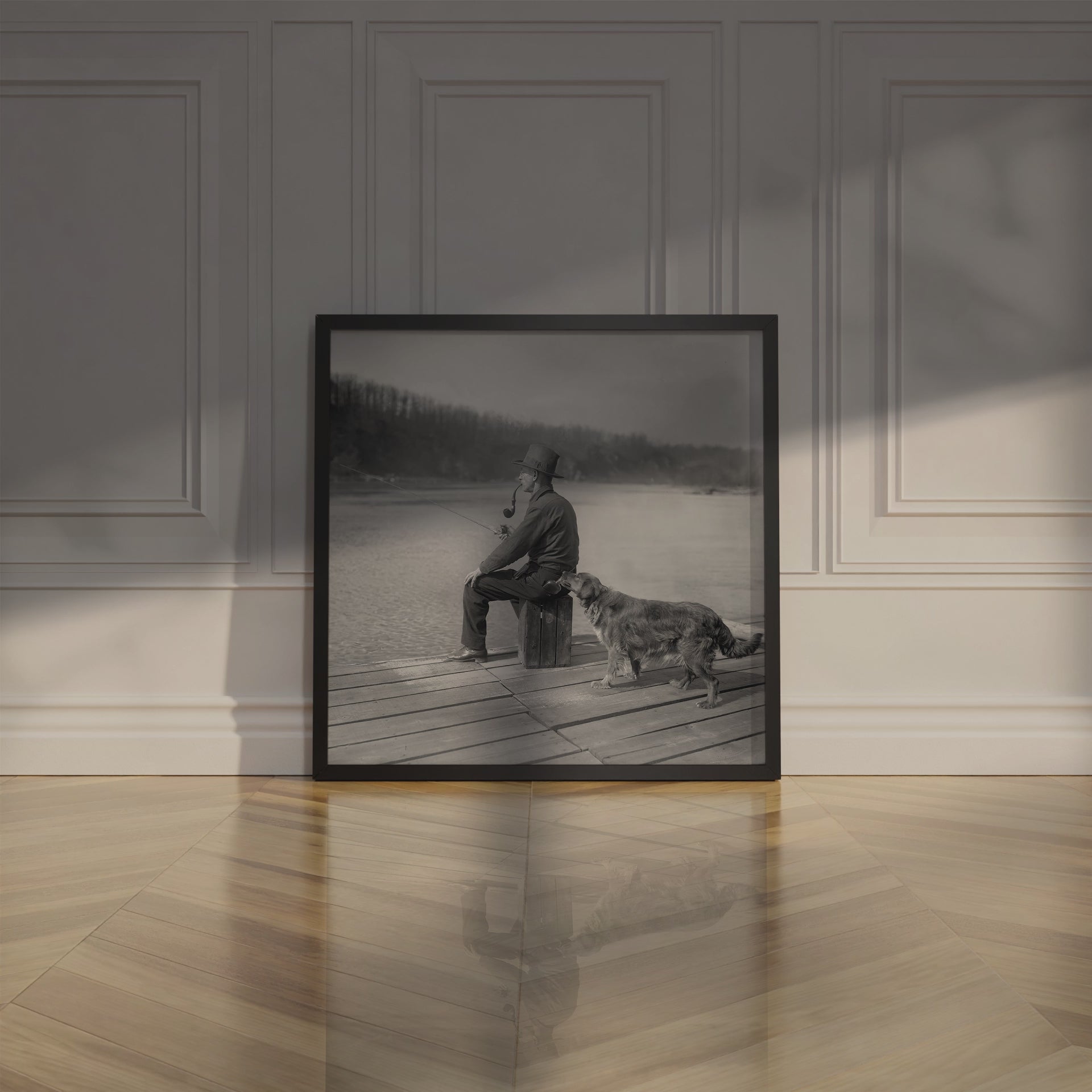 In this restored vintage 1922 black & white photograph, a dog trained to detect liquor sniffs at a flask in the back pocket of a man fishing from a pier on the Potomac River. This whimsical and fun Prohibition print adds character to any room and makes a great gift.
