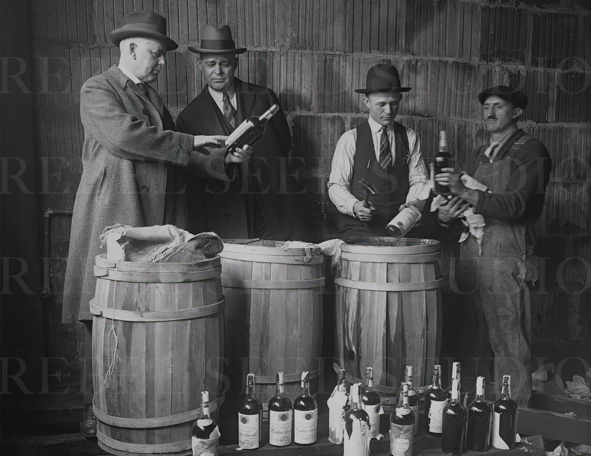 During Prohibition, Captain A.C. Townsend (from left to right), U.S. Marshal Palmer Anderson, Deputy U.S. Marshal A.J. Jostock, and a laborer look over confiscated liquor at a federal warehouse, circa April 1925. The men were ordered to clear out the warehouse for seized liquor to make room for Army purposes. This Americana print adds character to any room and makes a great gift. (Information about this image provided by the Chicago Tribune.)